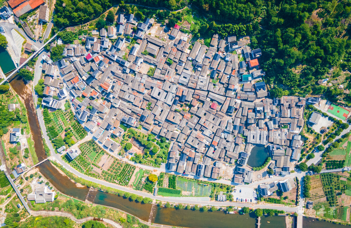 夏末的几天,带着酷暑的余威,走到了兰溪西北边的深处一个山村,村子坐北朝南,依山傍水,地势平整。村落东首,桃峰耸峙,芝山起伏,如一条青龙腾跃而来,村落西南,青峰壁立,山峦逶迤,有形神兼备的狮、虎两山雄踞村西,北面的陈陀山,背倚千峰万峦,像一把“金交椅”,把整座村落环抱其中,而南面村口象征“朱雀”的半月塘,使整座村落形成了一个以“左青龙、右白虎,前朱雀、后玄武”为格局的典型风水生态环境。
