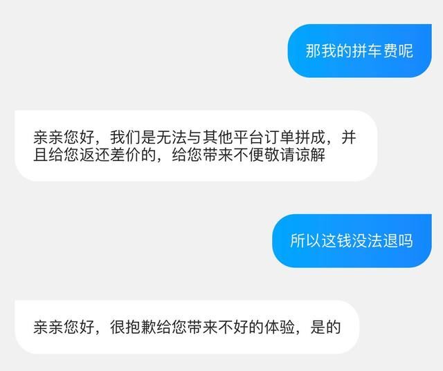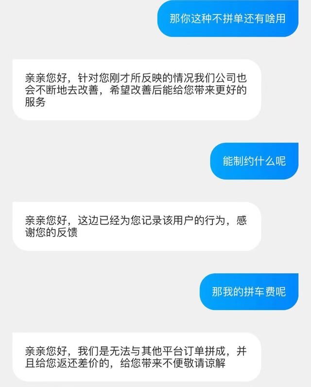 这是跟客服的聊天对话。客服说在订单上就查到只有一单,因此他们认为司机就应该收不拼单的价格。而我将照片给他们发过去的时候,竟然说的是和其他平台的拼单不算拼单。那请问这里设置不拼车的意义何在? 我们设置不拼车就是为了节省时间,有更多的空间。但是如果现在的司机都这么做,那这种不拼车的意义又何在呢?又如何做到很好的监管呢?有怎么服务更多的乘客呢?又怎么取得消费者的青睐呢?