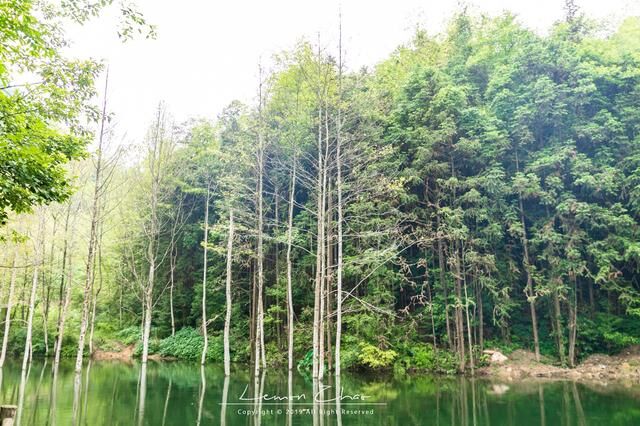 百丈崖景区可以说是上天的馈赠,整个峡谷全长约为3公里,里面遍布着绿树、怪石、碧水、青山、飞瀑等等,光瀑布就有三十多处,小溪潭更是数不胜数。刚进入景区便可以看到这一处长在水中的杉树,倒是有几分四川藏区的味道,煞是好看。