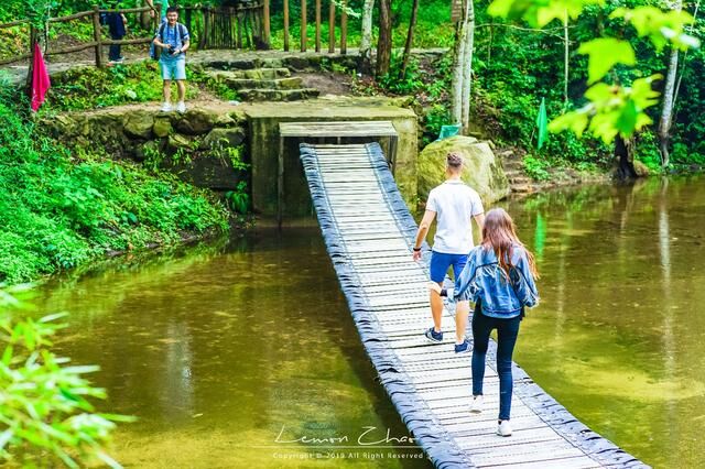 这些项目不仅对于中国的游客充满了挑战性和趣味性,就连我们的外国友人对于这些挑战也是十分的感兴趣。在我们行进的路上就遇到了几个外国友人,他们对于这些项目都充满着好奇心,看到哪个都想去试一试。比如这徒手走钢丝,没有安全绳的保障,而且水虽然很清但是却非常深,对于不会游泳的小伙伴们也着实是个不小的挑战。
