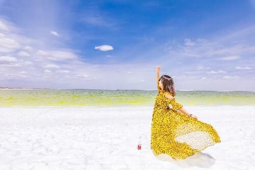 当双脚触碰到察尔汗的盐粒的时候,我就深深地爱上了这里。在我脚下的不是土地,而是盐盖,下面是暗潮涌动的卤水。看着往来的游客在这里摆着各色的姿势,拍着各种美丽的照片,这竟然成为了一种难得的享受。放眼望去,盐湖颜色变化层次感很强,湖面如同一块块绿宝石,晶莹剔透。