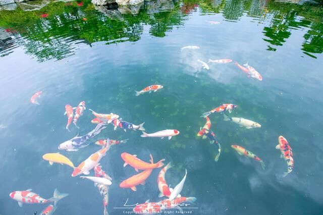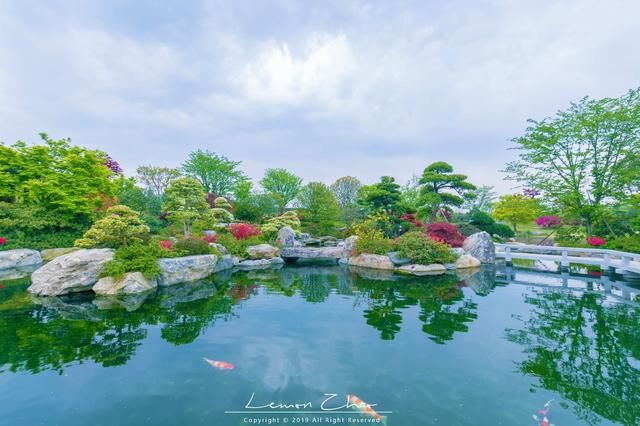 花朝园里的这个水池造景深得我意,每一块石头错落有致,虽然星罗棋布也不显得那么杂乱无章。一山一水一石,尽态极妍,据说这些都是顶级的风水大师和园艺造景大师亲自设计打造的,没有多一块石头,也没有少一棵树木,一切都是刚刚好,怪不得看上去如此的赏心悦目呢。池中饲养着一群锦鲤,色彩各异,体型硕大,慢悠悠地在池中嬉戏,惹得游人纷纷驻足拍照。