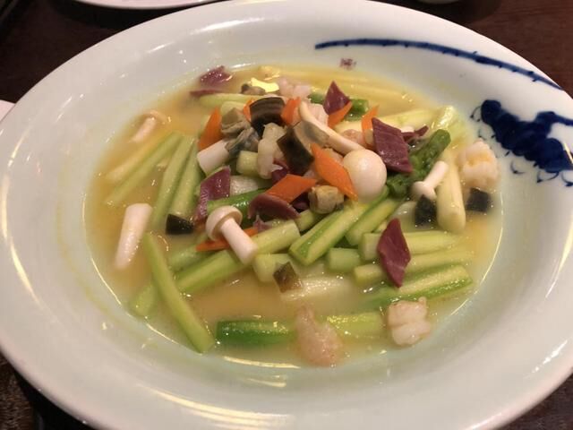 我们另外还点了一个“上汤芦笋”。里面有虾仁、火腿等配料,芦笋非常的脆,十分有弹性也非常爽口。