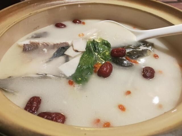 由于已经算是过了饭点,我们点的不算多。“千岛湖有机鱼头”必然是要来一个的,488元半个,728元一个。我们要了半个鱼头,里面可以选择少盐少油。从点单到上桌大约花了四十分钟左右的时间,上来有一个简单的剪彩仪式,用雕刻着精美图案的剪刀剪开砂锅上的红纸,并说了几句吉祥祝福的话讨个好彩头也就可以开锅啦。里面有红枣、枸杞、青菜、豆腐等食材,满满的一锅白花花的鱼汤非常养胃,一口气可以喝下好几碗。