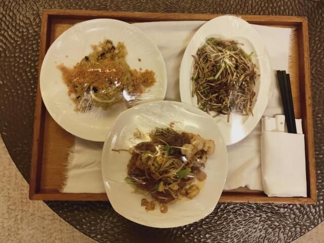 有一顿午饭我们体验了酒店的叫餐服务。房间有送餐菜单,照着菜单给送餐部门打电话就可以了。我们点了“菠萝海鲜炒饭”、“海鲜炒粉丝”以及一份炒香干。整个过程差不多三十分钟左右就已经送到了房间。为了保持食物的干净和温度还给餐盘附上了保鲜膜端上来,味道也是非常的不错的。吃完了连托盘放在门口就可以让服务员拿走了。