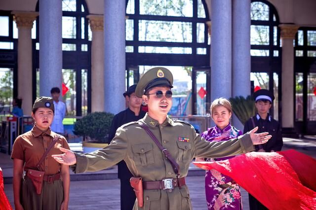 我们大约是早上八点半左右到达了景区门口,门口的音乐已经响起,却还是不见景区开门。还没等我走到正门口,门口不知从哪儿出来了一群演员载歌载舞好不热闹 。最后在一位身着司令装扮的演员的一声令下,湖州影视城正式开园了,在演员的簇拥之下,我们缓步走进了湖州影视城内。