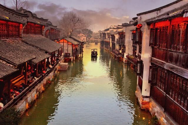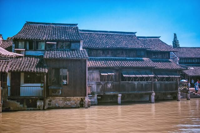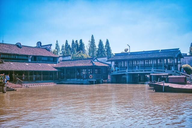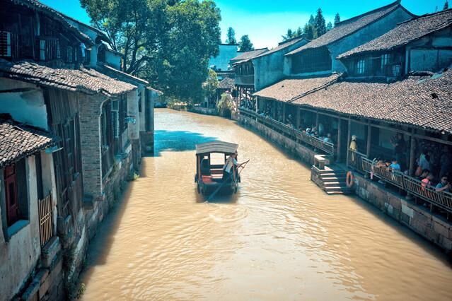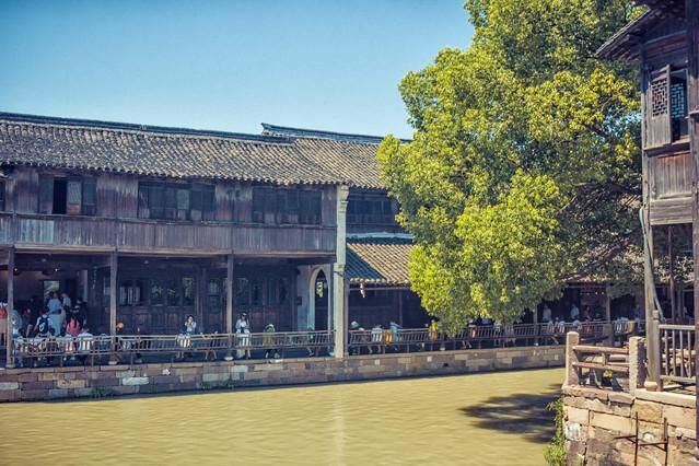 西大街现在则成了一条购物街,吃的喝的这里都有,你想买的纪念品,想要的明信片这里也都能买到。如果累了,这儿多的是茶馆,在河边坐下来,看看流水,想想心事,两个人对视一笑,似乎都在心照不宣地想着什么。空气中飘来一阵酒香,不知道是哪家酿的陈酒开了坛,只引游人醉;河案头几位大妈闲聊家常,洗着刚从田里摘的菜;身边走过一位乌镇的姑娘,身上穿着的是自家染的蓝印花布做的旗袍;一盒刚刚出炉的姑嫂饼,不知道从哪儿飘来的香气,是要送给她的情郎;相约桥头,坐看夕阳,然后又要去修真观听戏;远处一艘小船摇了过来,欸乃的桨,轻轻唱和着船娘的歌声。
