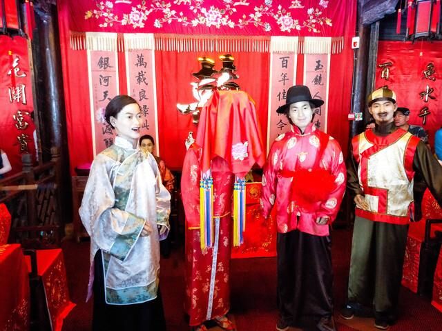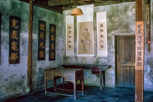 经过一个街头便是清代的香山堂药铺,里面还原着当初的场景,斑驳的柜台,琳琅满目的药品,还有问诊的柜台一应俱全,生动地还原了当时药铺悬壶济世的场景。
