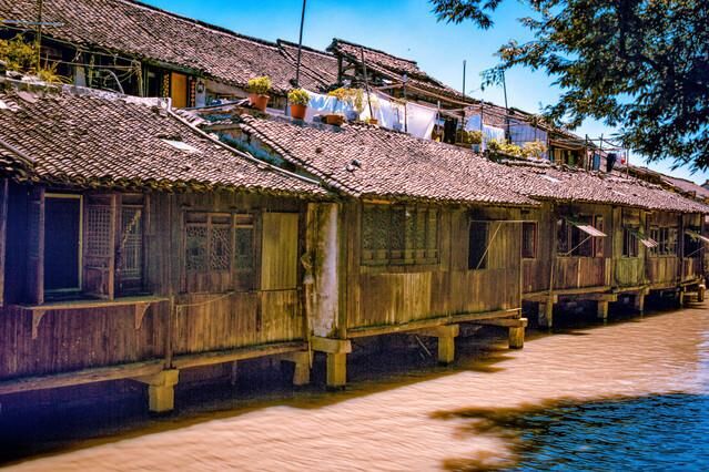 走在街道上,熙熙攘攘的都是游客,很是热闹。家家户户都是两层的木楼,临水而建,面河当街。巷子很瘦,房子也很小。走在这样的街道里,言语都是多余的,只是你从来一眼看不到尽头的街道,家家连排着的房屋,大门从来不关,邻里乡亲都十分的和睦亲切,仿佛这里的人都是一家人一样。