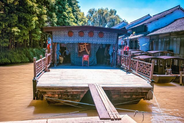 进入景区,首先来到的便是财神湾,所谓财神湾不过是停泊的一个小码头,因为河道太窄,行船无法掉头,所以在这儿修建了一个较为宽敞的转弯停泊去,也自然而然成为了小镇最为热闹的地方,也就成为村民的集散中心。