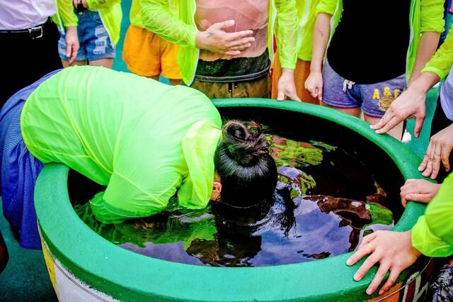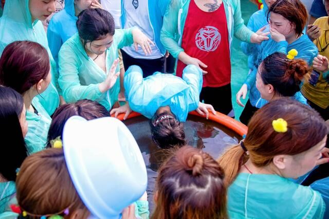 你看我们主持人小姐姐还在坚持着自己的直播,身上早就被泼上了深深的祝福。来自各个地方的人群就像撒了欢似的冲到水缸面前,用手里的脸盆、水枪互相泼着水,互送着凉意也分享着喜悦。这时候每个人都是快乐的,大家的脸上都洋溢着幸福快乐的笑容,小孩儿在水中穿梭打闹嬉戏,大人们无论老少无论年龄,在这儿都成了最单纯可爱的孩子,不管是认识的不认识的,在这儿不需要语言的交流,只需要用最圣洁的水向对方送出祝福。