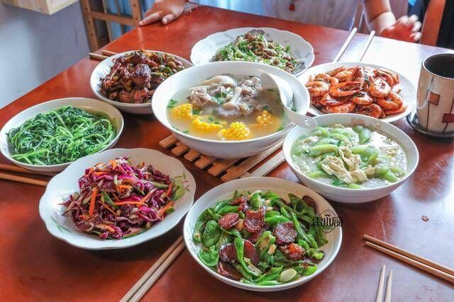 第1桌:蚝油基尾虾+毛豆烧鸡肉+仔姜炒鸭肉+青椒炒腊肠+丝瓜炒蛋+凉拌紫甘蓝+玉米排骨汤+青炒米苋