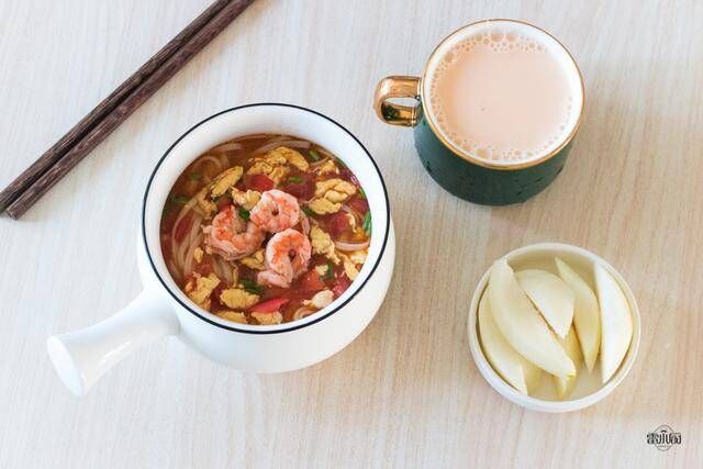 周一: 【鸡蛋虾仁面】+【梨】+【养乐多】虾仁去头,去线,去壳,锅中加水烧开,放虾仁,料酒,生姜焯水捞出,起锅下油, 先炒鸡蛋出锅,再下番茄炒出汁,倒入鸡蛋,食盐,翻炒均匀,加水煮开,下面条,将面条煮熟 ,倒入虾仁,撒葱花点缀出锅。