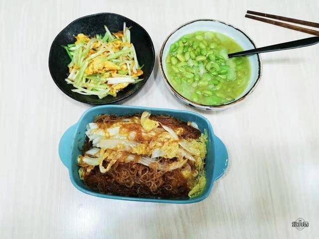 周一:【韭黄炒蛋】+【粉丝蒸娃娃菜】+【毛豆炒丝瓜】