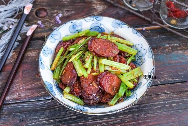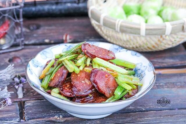 小厨今天带来的这腊肠,也并非自家做的,也是买来的, 一般买来的腊肠,为了可以储存更长的时间,商家都加了大量的食盐,所以味道会偏咸,像腊肉,咸肉都一样,如果是买的,烹饪之前,有一个动作一定不能少,否则又咸又难以下咽,那就是得下锅煮五分钟,把它的咸味煮出来,再加点芹菜一起翻炒,味道就绝了。简值就是天生一对的,炒出来香喷喷的,好吃又下饭。来,米饭给我先上三碗。不说了,先吃了。