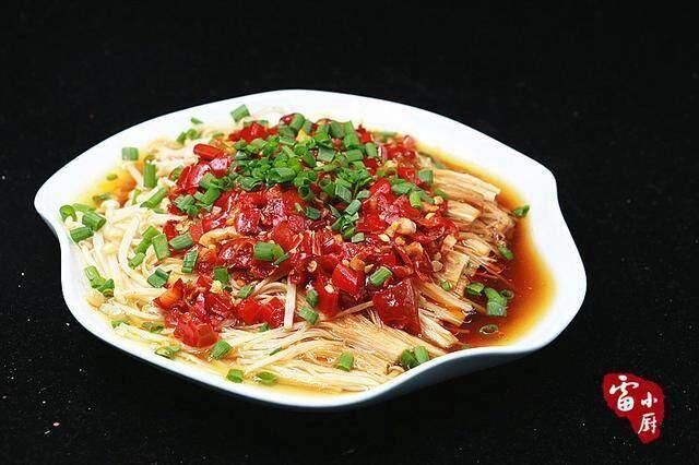 食材:金针菇,剁椒,小葱,熟 油,蒸鱼豉油,生抽,大蒜, 制作步骤: