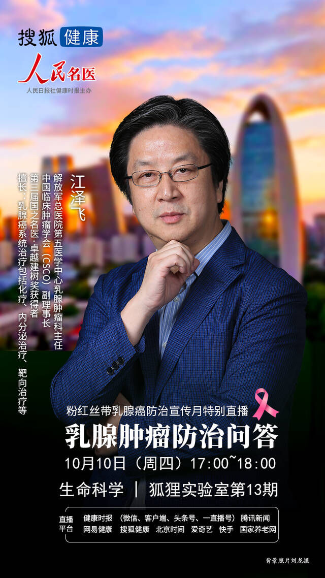 10月10日(周四)下午17:00~18:00,中国临床肿瘤学会(CSCO)乳腺癌专家委员会掌门人、解放军总医院第五医学中心乳腺肿瘤科主任江泽飞教授将做客搜狐健康·狐狸实验室,为您支招乳腺癌防治。