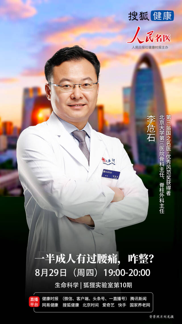 腰痛一般什么原因,腰痛应该怎么处理?哪些腰病需要重视,哪些腰病必须手术?8月29日(周四)下午19:00,擅长腰椎疾病诊疗的脊柱外科一把刀、北京大学第三医院骨科主任、脊柱外科主任李危石教授将做客搜狐健康·狐狸实验室,与您交流腰痛腰椎问题、为您“撑腰”。
