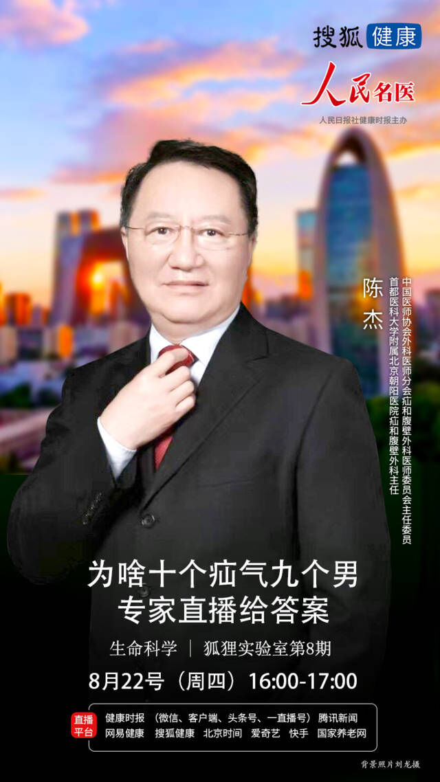 为啥十个疝气九个男,疝气防治有没有什么好方法?8月22日(周四)下午16:00—17:00,创立国内第一家疝与腹壁外科一级科室的北京朝阳医院疝和腹壁外科主任陈杰教授将做客搜狐健康·狐狸实验室,和您聊聊疝气的那些事儿。