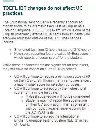 因考题减少,所以缩短测试时间(3小时而不是3½小时); 提出了My Best Scores拼分政策。作为加州大学(UC)所能接受的国际生语言考试之一,尽管托福考试改革的增强对于考生来说意义重大,但是加州大学也表示,托福考改不会对该校目前的做法产生影响: