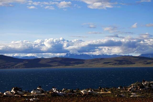 其实圣湖鬼湖原本为一湖,由于气候变化,湖泊退缩,水面下降,才由一条狭长的小山丘把它俩分开。
