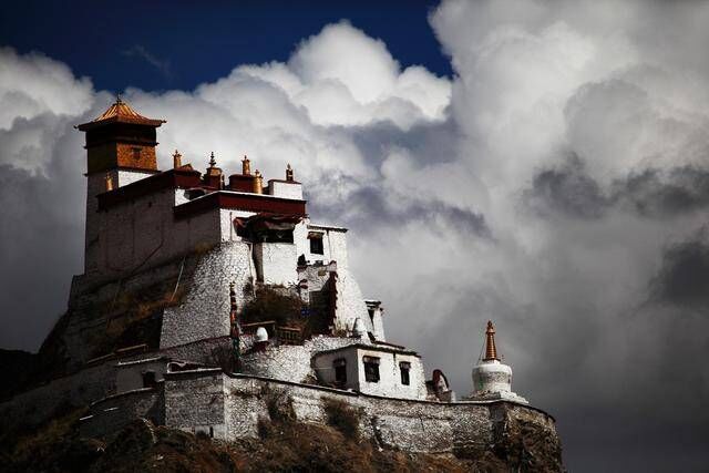 雪白的外墙,红色柳枝堆成的女墙,最高的碉楼顶上,金顶正在阳光下闪耀。强烈的纯色带给人震撼的视觉冲击……