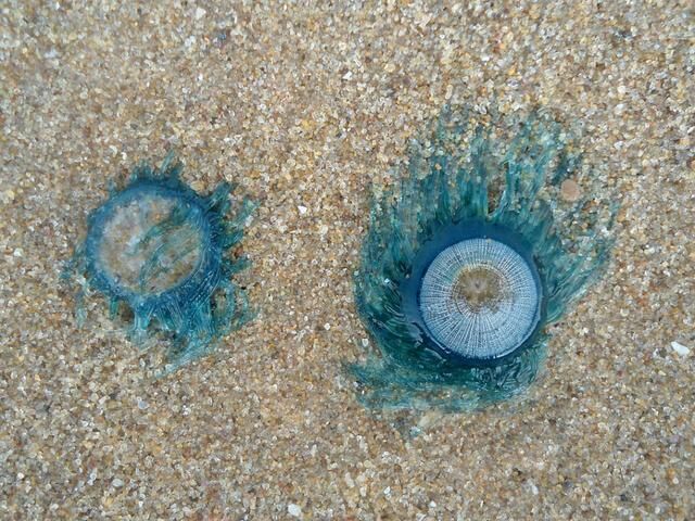 这种小动物看起来跟水中的水母是比较相似的,至于说它的出现,很有可能是因为当地的飓风导致的,将其他地方的热流吹到了这个海湾之中,或许是来自大西洋强大的潮流,从而其他地方的海洋生物带到了这个海滩之上,从图片可以看出,这种蓝色的看起来像是纽扣一般的东西,确实是非常的漂亮,这种蓝色是特别鲜艳夺目的