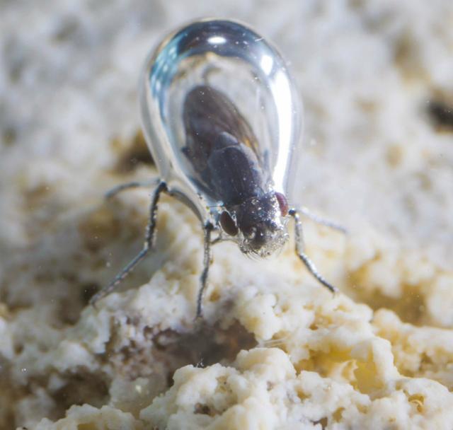 那么为什么碱蝇潜入水底之后,并不会将自己的身体弄湿呢?大家如果仔细观察这种小动物潜入水底的时候,就会发现在它的身体周围其实是会形成一个像是水泡一样的东西,将它完全的包裹在里面,只是将自己的口器留在外面,这样到水底能够捕食食物,至于身体别的部分完全就在这个水泡之中,正好将外面的水隔绝,这样就会让自己的身体一直是处于干燥的状态。一种极端的防水现象,称之为超疏水性。