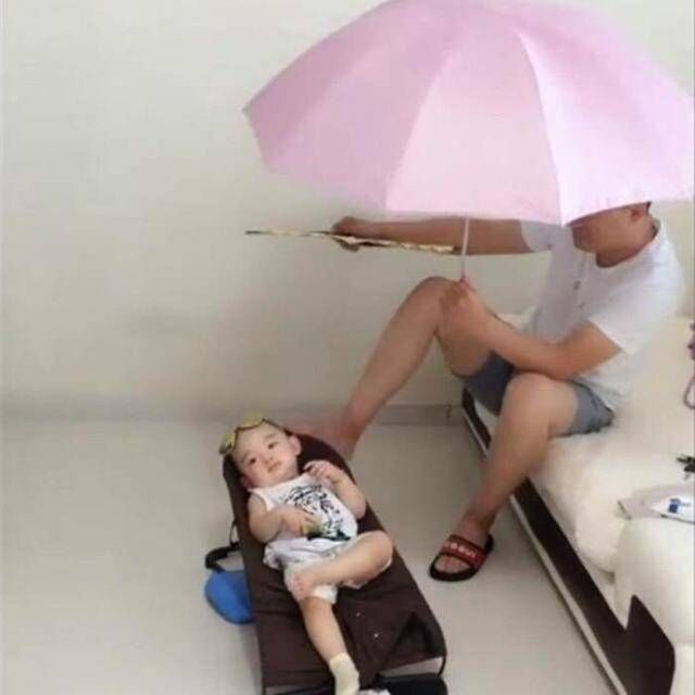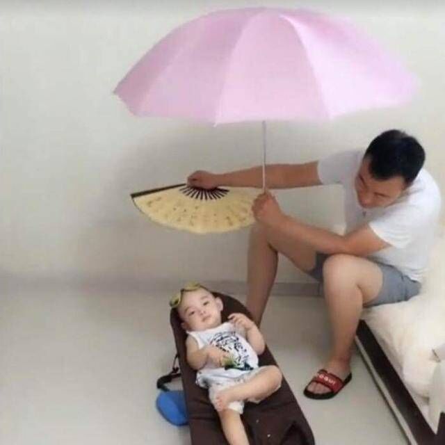 其实在妈妈工作的时候都是在想着家里面的那父女俩的,因为丈夫这真的是第一次一个人在家带孩子,但是当她熬到下班的时候,看见的眼前的一幕,让她笑的连大米饭都喷了出来。只看见女儿在躺在一个小椅子上面,上面撑了一把伞,爸爸在旁边给她在扇风。