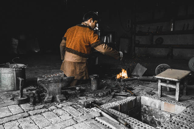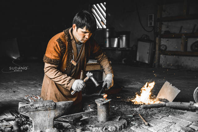 27岁的斯德克·艾再孜正站在一个一米来高的地坑里打制着镰刀。他动作娴熟的将一块弯铁放进碳火里烧到通红,然后拿出来用铁锤叮叮咚咚一番捶打。那打铁的声音恍如时空穿越,令人倍感温馨和亲切。