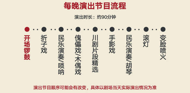 川剧变脸名胜在外,相信大家都有兴趣,还有就是古代的街头杂耍喷火。其它的民乐演奏,折子戏等也可以顺道体验一下。整场节目的时间大概是90分钟,上面说到的所有节目可能会因为各种因素而调整顺序,但是节目数量基本不变。