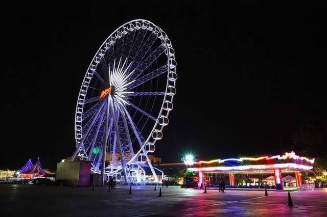 其次就是这里有一个很不错的项目,那就是夜市的摩天轮,这个摩天轮是夜市的一大特色,夜市一个地标,坐在摩天轮上可以看曼谷的夜市,而且据说这个摩天轮是转速最快的摩天轮,15分钟就可以转4圈,哈哈,我家门口的摩天轮,25分钟转一圈。如果有摩天轮情愫的可以体验,费用在90元人民币左右。