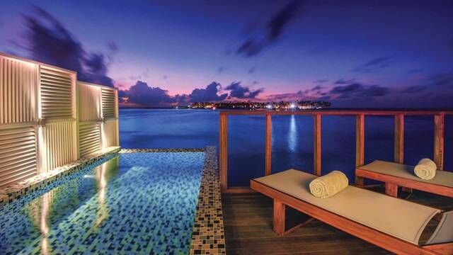奥静岛上的房屋类型多种多样,有水上别墅,这些连成一排的水上别墅,在大海上画出了一条美丽的弧线,而且私密感十足,晚上的时候可以在日光浴平台欣赏印度洋的夜景。