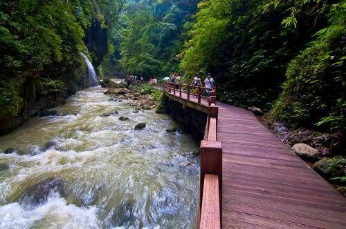 景区峡谷长13公里,游玩的时候建议从南门进,北门出,进景区之后有一个1公里长的下山石阶,从这里下去就是长达6公里的栈道和浮桥了,周边环境不错,有山有水,游客可以在这里游山玩水,享受这片只有21度的空间,一般游玩这段距离需要3-5个小时。