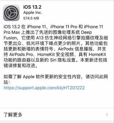 iOS 13.2 在 iPhone 11、iPhone 11 Pro 和 iPhone 11 Pro Max 上推出了先进的图像处理系统 Deep Fusion,它使用 A13 仿生神经网络引擎拍摄纹理及细节更出众、低光环境下噪点更少的照片。其他功能包括更新和新增的表情符号、AirPods 信息播报,并支持 AirPods Pro、HomeKit 安全视频、具有 HomeKit 功能的路由器以及新的 Siri 隐私设置。本更新还包括错误修复和改进。
