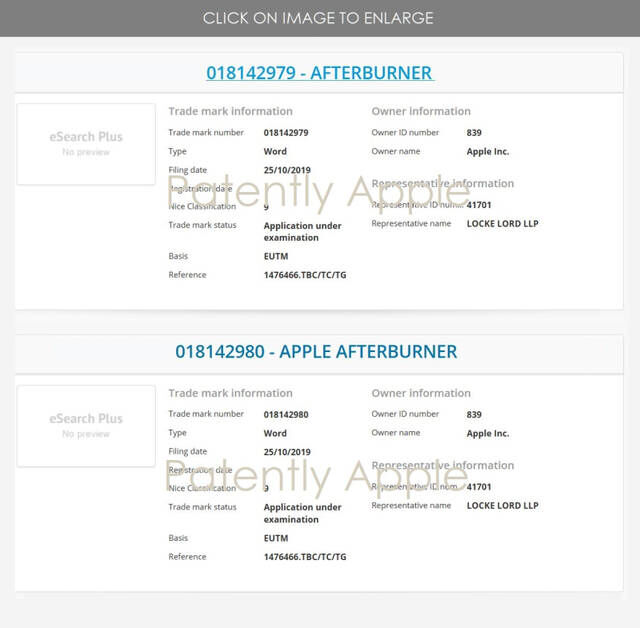 为了配合 Mac Pro 在年底的上市,苹果在欧洲商标局申请了 Apple Afterburner 技术商标,并且在美国地区申请了 Apple Pro Display XDR 商标注册。