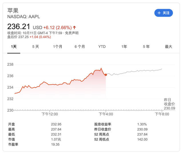 在本周苹果股票 AAPL 盘内上涨2.66% 盘后上涨0.44%,股价超过2018年10月3号的最高点,目前价格237.25刀。