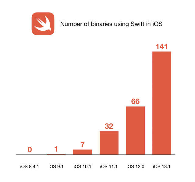 自 iOS 9 之后,开发者 Alexandre Colucci 一直在统计苹果系统中 Swift 的使用情况。最新的数据显示,在 iOS 13 中,一共有 141 个使用 Swift 编写的二进制可执行文件,是 iOS 12 的两倍多,iOS 12 中有 66 个。