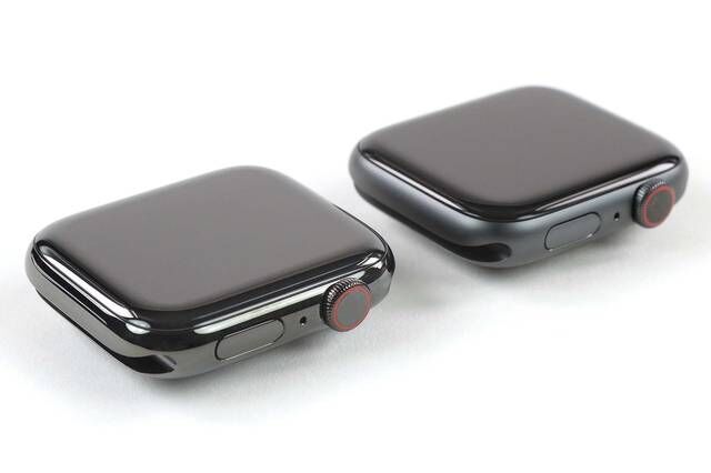 Apple Watch Series 5 的电池容量旅游提升,下图中左侧是 Series 5,右侧是 Series 4。Series 5 的电池容量为 296 mAh,Series 4 的电池容量为 291.8 mAh。