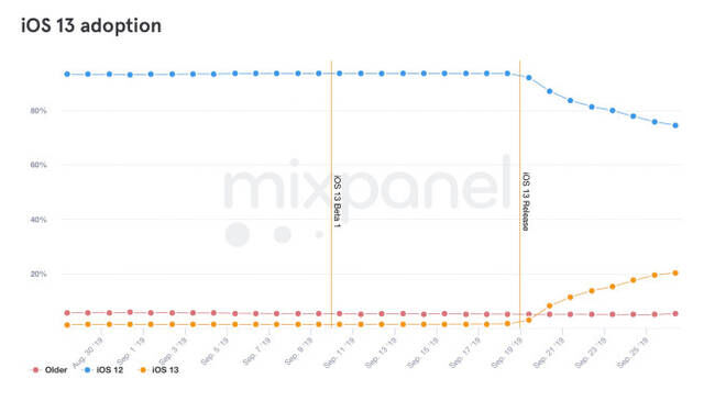 苹果 9 月 19 日推送了 iOS 13 正式版系统升级,距离现在刚好一周。根据来自 Mixpanel 的数据,iOS 13 的安装普及率超过了 20%。与去年发布的 iOS 12 相比,iOS 13 的普及速度更快。