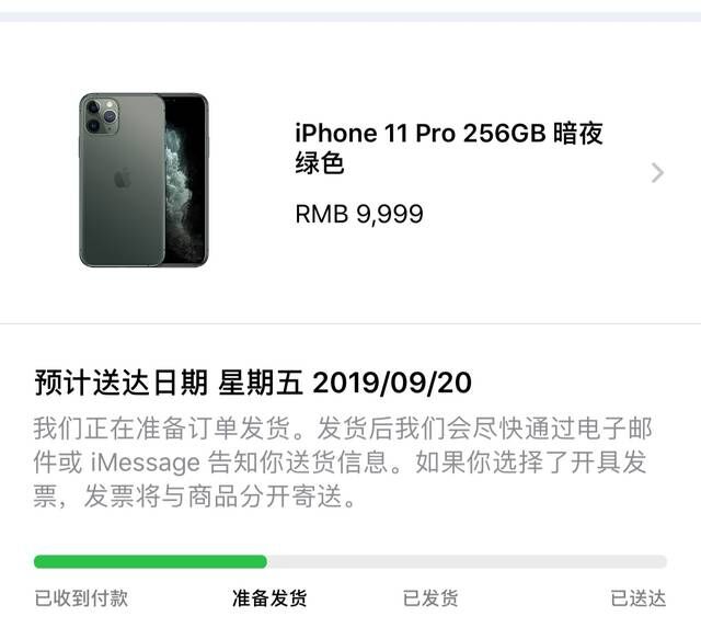今年改变了去年破发的历史,iPhone 11 Pro 绿色的成为了今年的爆款。目前下单已经需要等待半个月才能发货。目前官网的第一批订单已经开始准备发货状态。不出意外的大家会在 9月20号 收到自己心爱的iPhone 11 Pro 与 iPhone 11 Pro Max 。