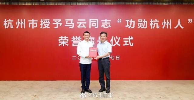 为表彰马云同志为杭州发展作出的卓越贡献,在阿里巴巴集团成立20周年之际,9月7日,杭州市委、市政府举行授予马云同志“功勋杭州人”荣誉称号仪式。浙江省委常委、杭州市委书记周江勇出席,并为马云同志授证书和印章。