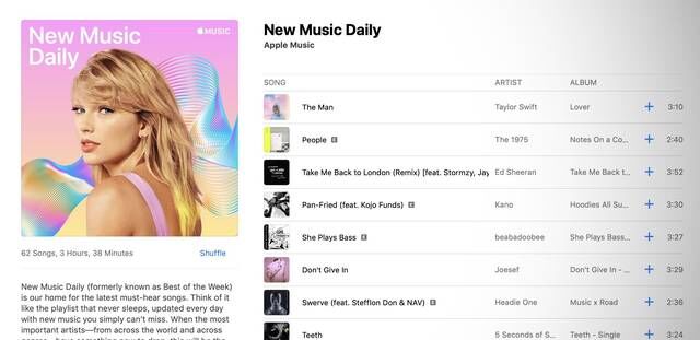 榜单上的首支主打单曲是泰勒·斯威夫特(Taylor Swift)的新专辑《The Man》,封面上还有她的一张照片。据推测,苹果将在滚动的基础上推出领先艺术家的作品。