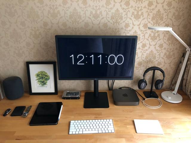 左侧的 HomePod 在下面的梅赛德斯钥匙面前显得黯然无光,当你的视角向右一动一些,看到了出门移动最强平台, iPad Pro 和那根那么直那么白的苹果笔二代。
