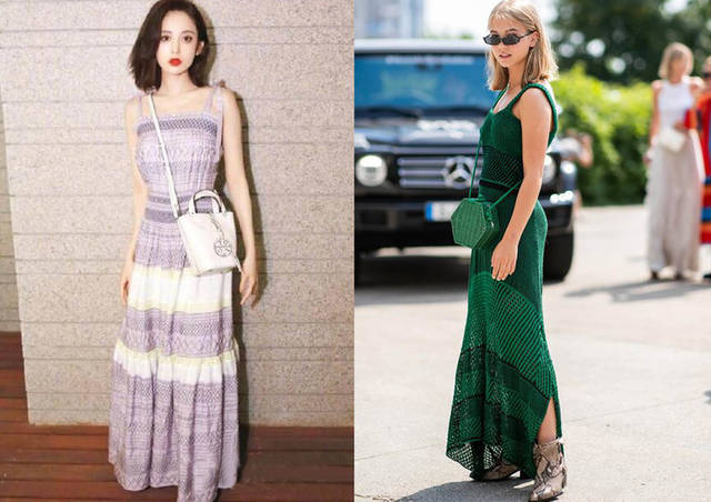 ♦选择长款的吊带连衣裙,其中少女的造型选搭,淡粉紫的色调,细节元素:小花边、蕾丝的选择,搭配白色包包,甜美范的造型。如果选择绿色调的款式,那么颜色的选搭大胆尝试,穿搭组合时,简约白色包包就妥妥的。