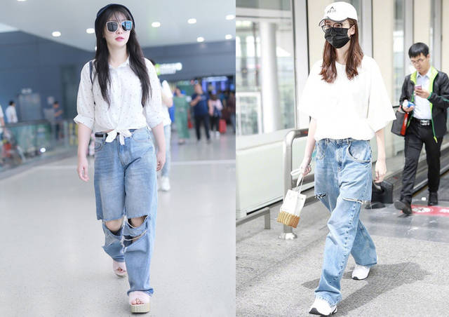 ♦在选择简单的白色上衣和破洞牛仔裤组合时,上图一中的白色波点上衣和宽松裤装搭配,上衣的下摆打结,炫腹的小造型出街。或者是选择整体简约搭配,白色宽松T恤(纯色)和浅蓝牛仔裤组合,白色的包包和鞋子组合,棒球帽推荐搭配。