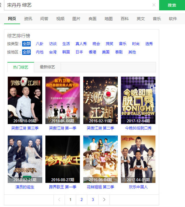 如果在词条中打“宋丹丹 综艺”的话,出来的综艺足有3页,这还不包括她当飞行嘉宾而上的综艺。大家最熟悉的应该就是湖南卫视大型慢生活《向往的生活》中的宋长英以及她留下的那首名为《心火烧》的神曲。近日,宋丹丹甚至还出现在了爱豆养成类综艺《明日之子》第三季中。