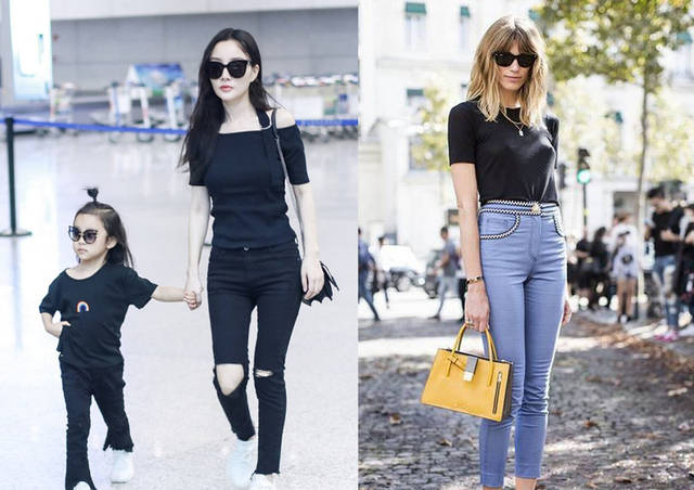 ♦黑色上衣一字肩的款式和黑色紧身裤搭配,简约造型穿搭,最简单的气质出街装。选择黑色T恤和牛仔裤组合时,牛仔裤的颜色推荐选择浅灰蓝色调,那么包包有多种彩色搭配,上图二黄色适用提包造型。