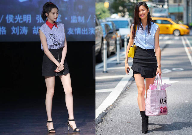 ♦日常简单的无袖款单品,像关晓彤的条纹衬衣无袖款,选搭黑色短裙,气质简单的造型搭配。还有就是纯色款的上衣和黑色短裙搭配时,简单的颜色,像裙装荷叶边或者小花边装饰,减龄小造型,包包都有多种彩色选搭。