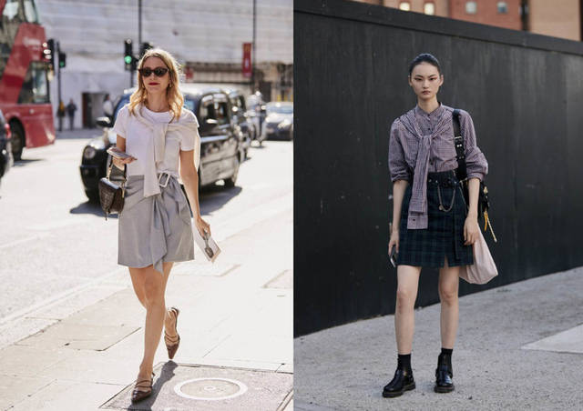 ♦日常简单的出街穿搭,选择色调的搭配时,简单的灰白色组合,或是深色调的搭配。白色T恤和灰色短裙搭配,短裙的腰部细节腰带装饰,配选择黑白都可以。还有就是深色调的格纹衬衣和深色格纹短裙搭配,衬衣的细节款式变化(上图二),配色选择黑色。